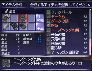 競売でニーズヘッグの鱗が入手できたので、ドラゴンメイルのレシピで龍の鱗のかわりにニーズヘッグの鱗を使うとドラゴンメイルHQができる、というウワサの真相を確かめてみました。